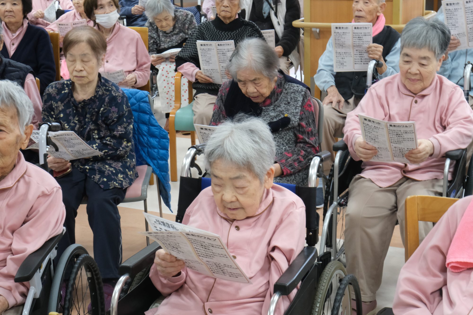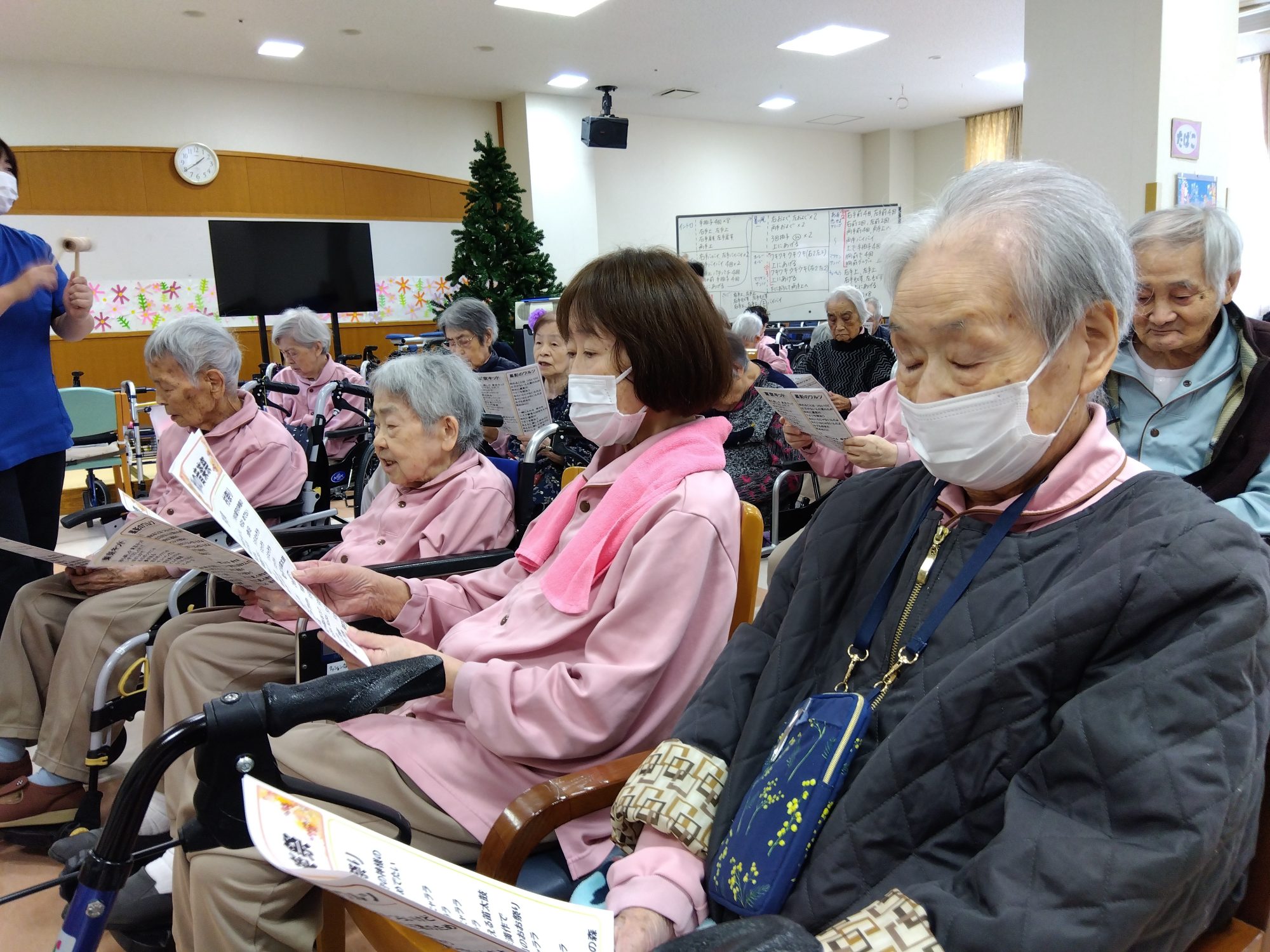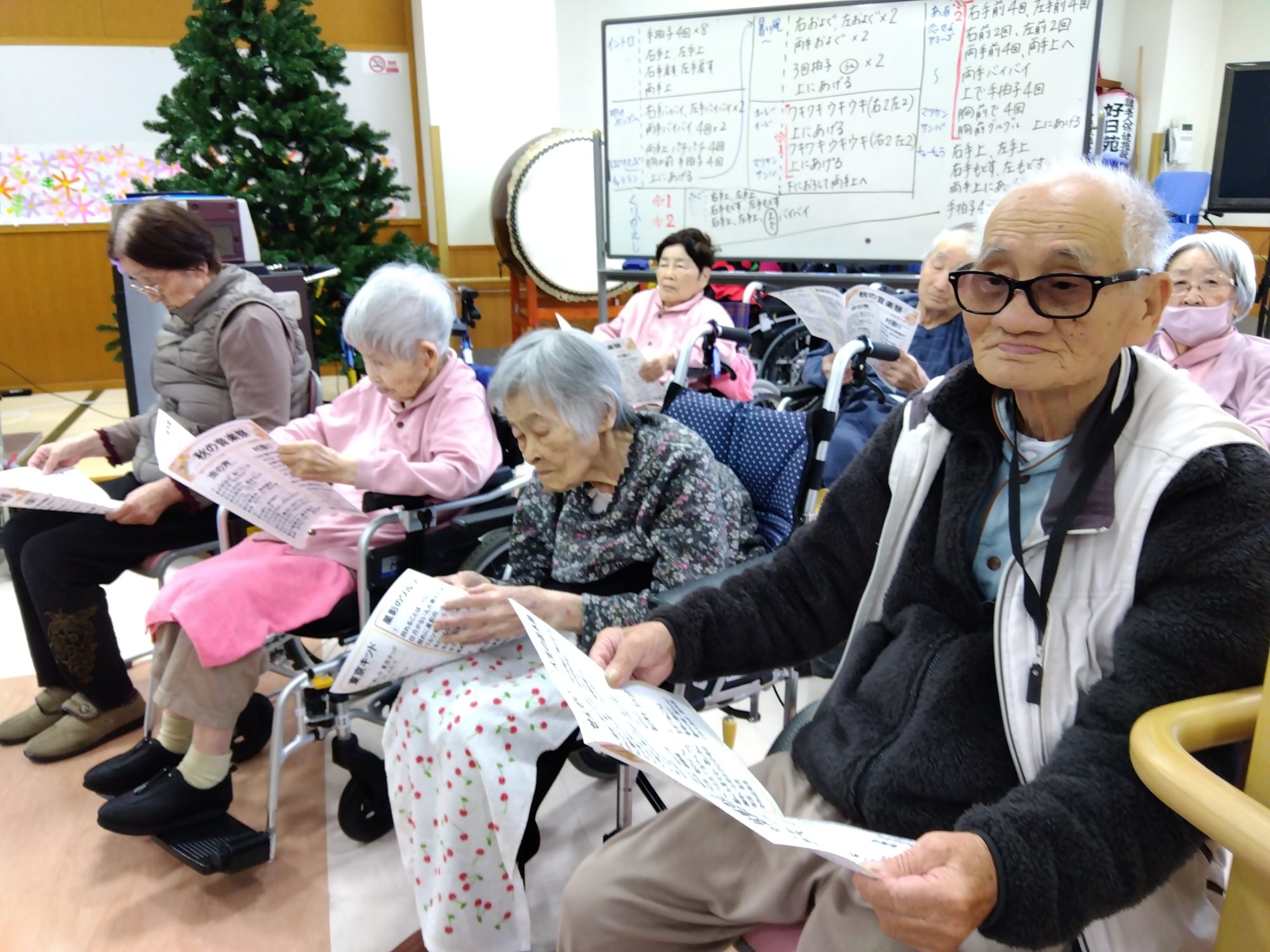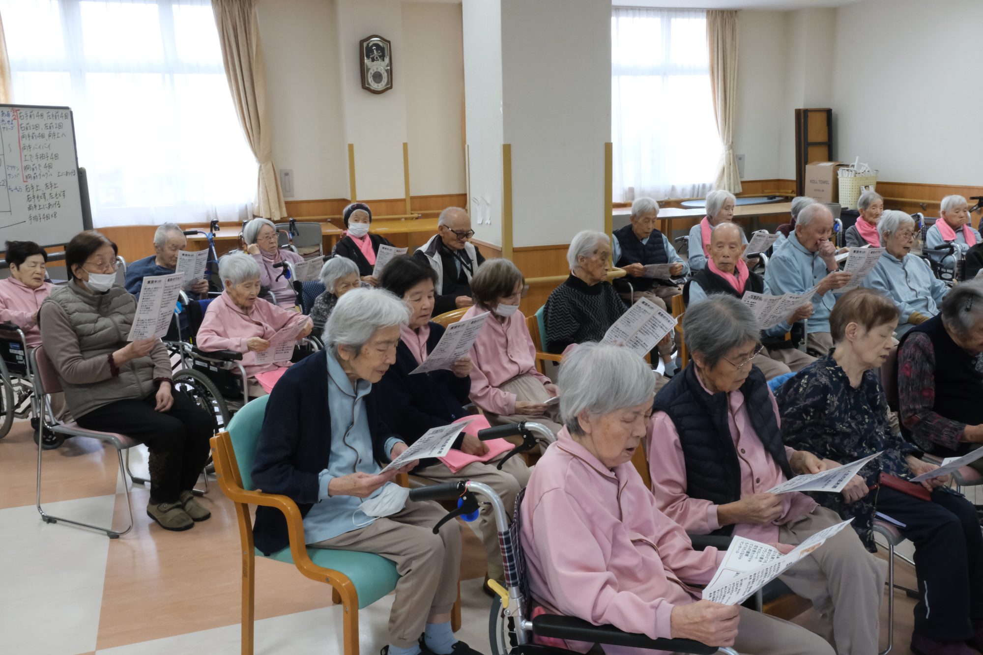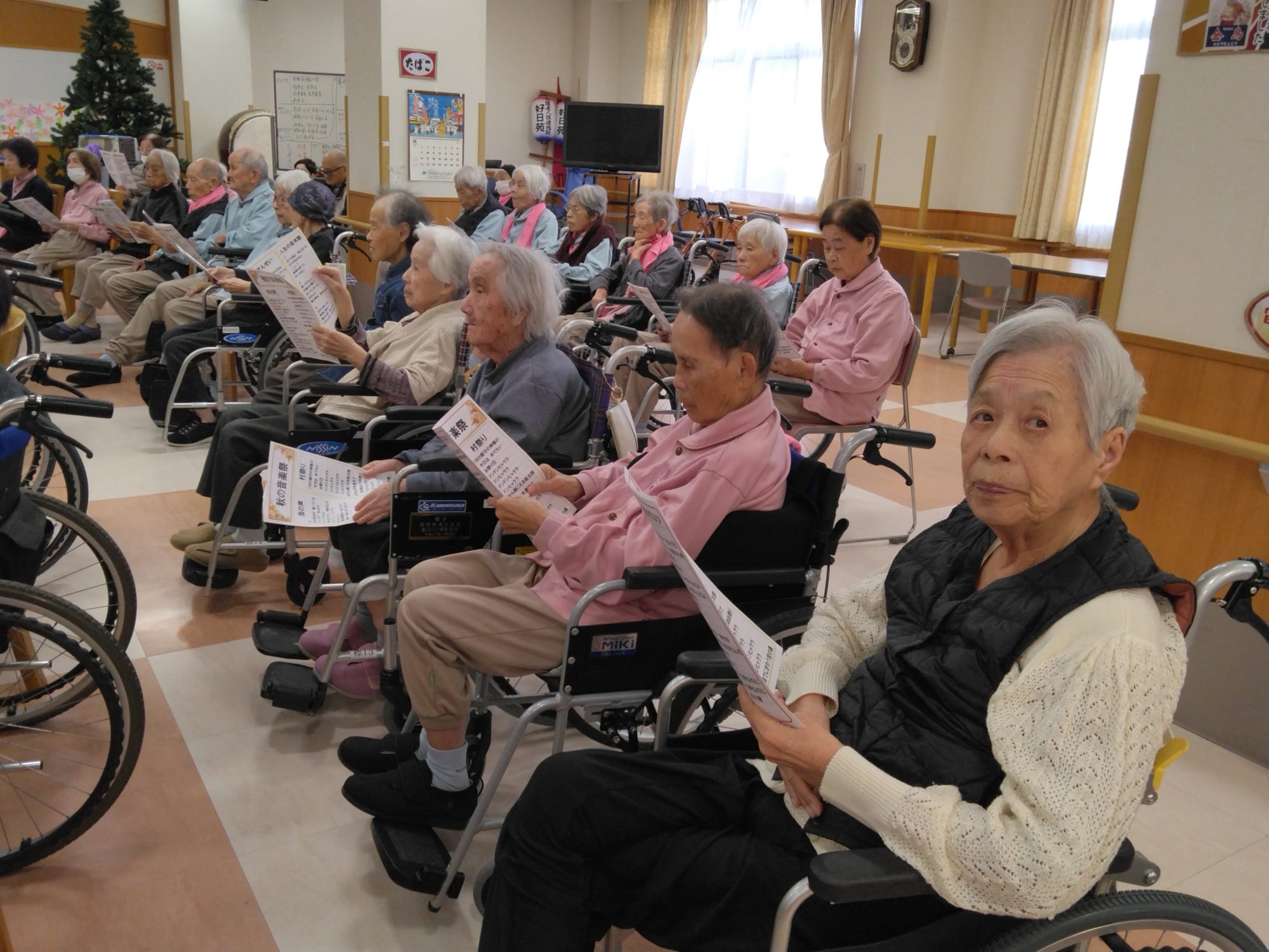 後半は『せんせい』『人生の並木道』『東京キッド』『星影のワルツ』といった馴染みある歌謡曲を歌いました。利用者様方も昔を思い出しながら大きな声で歌ってくださいました。