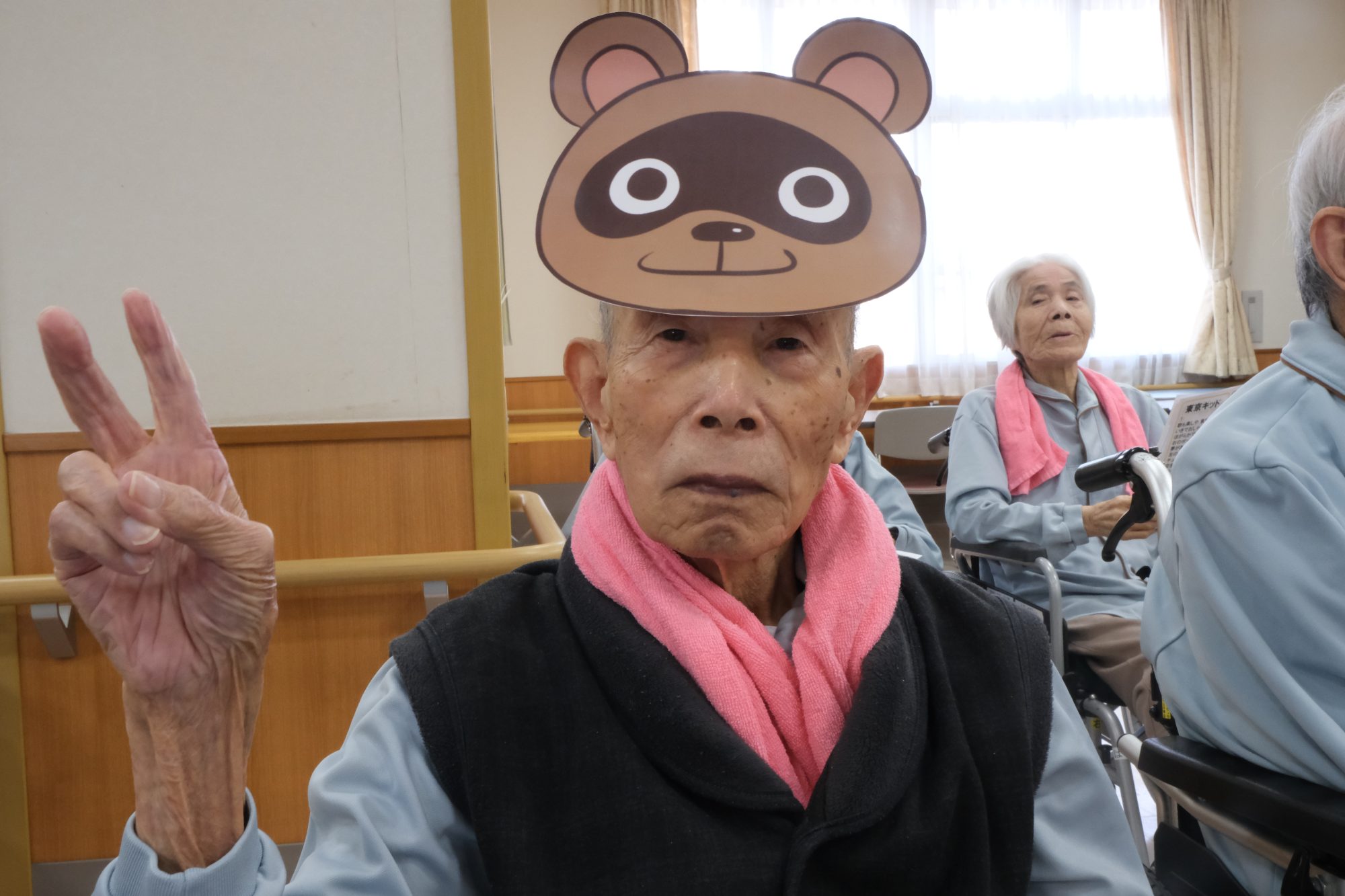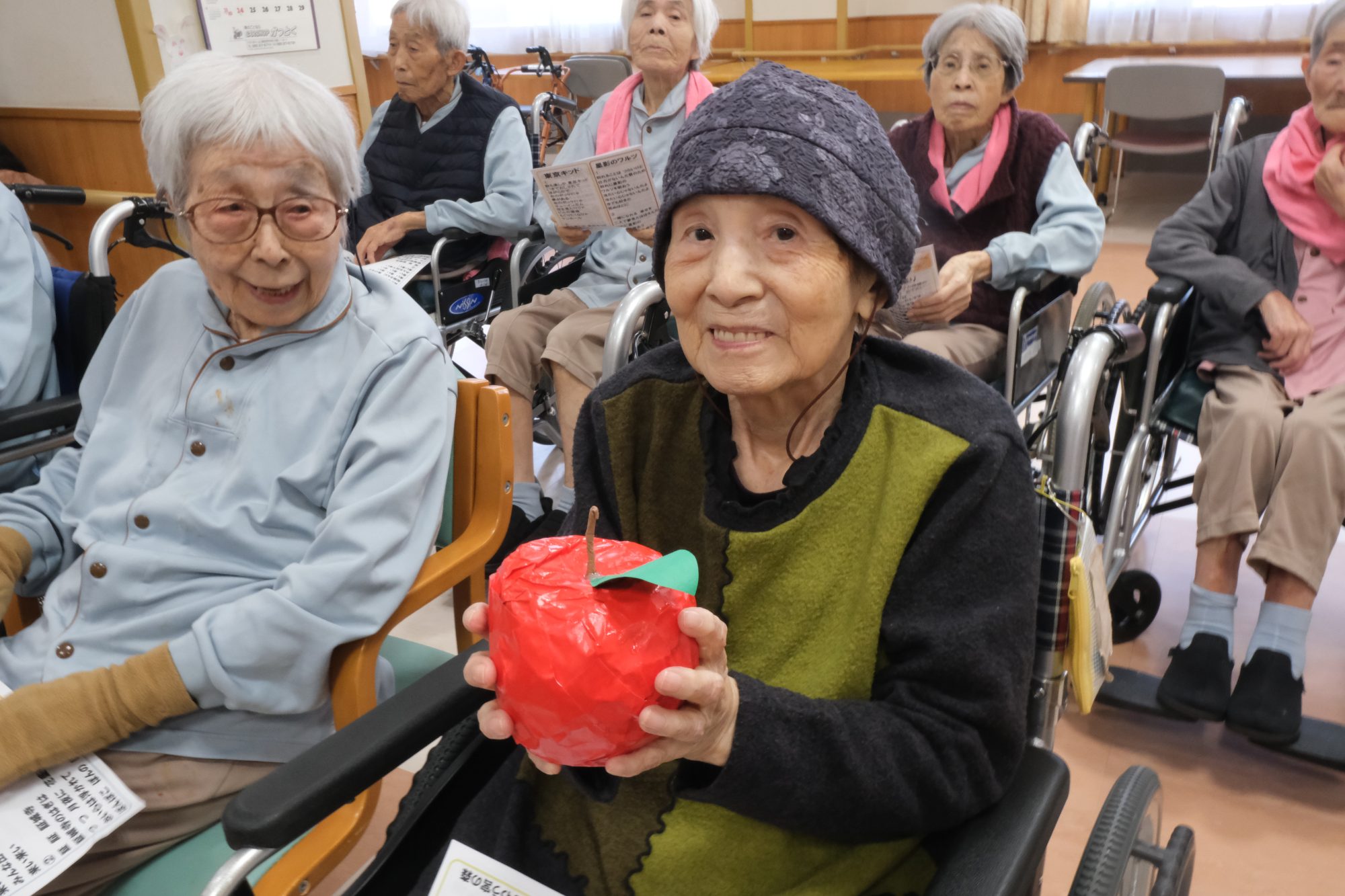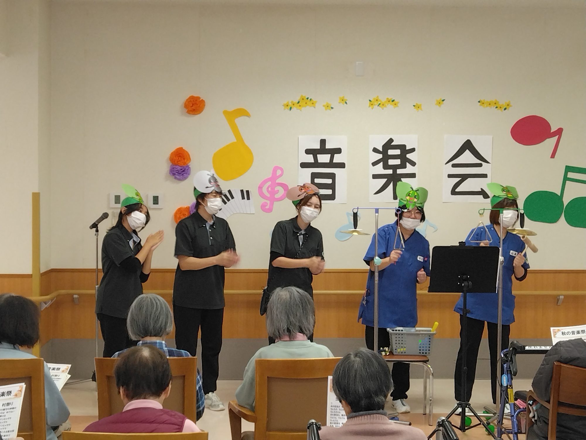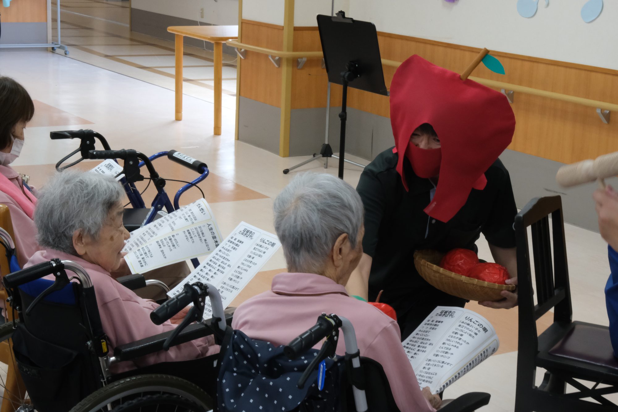 前半の音楽祭は『虫の声』『村祭り』『証城寺の狸』『りんごの歌』等の童謡を中心に、スタッフの演奏に合わせ利用者様が合唱をしました。どの歌もスタッフの渾身の仮装や楽器演奏があり、目で楽しみながら歌を口ずさんでいました。