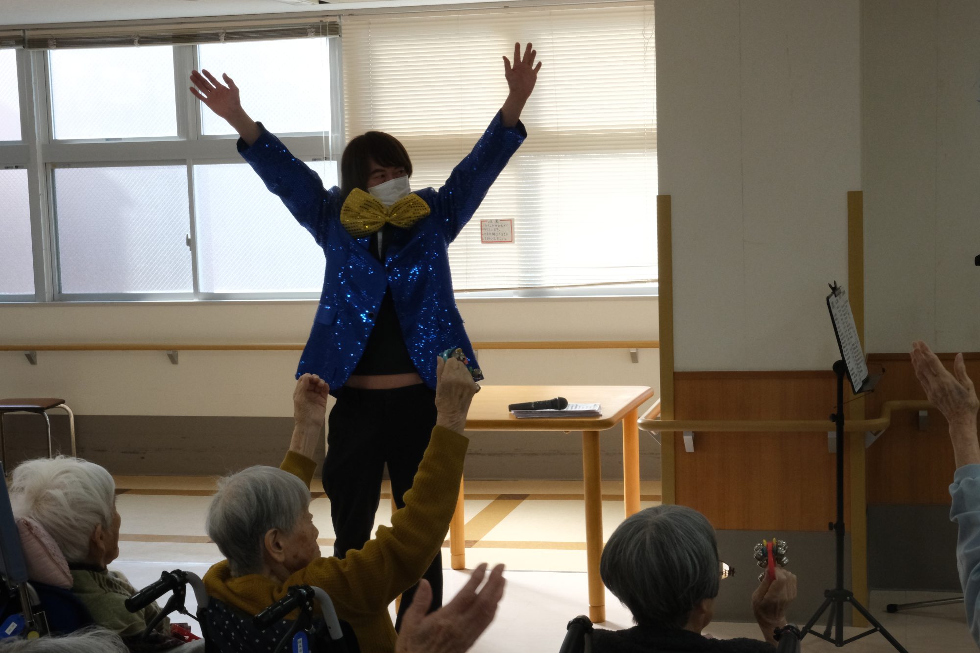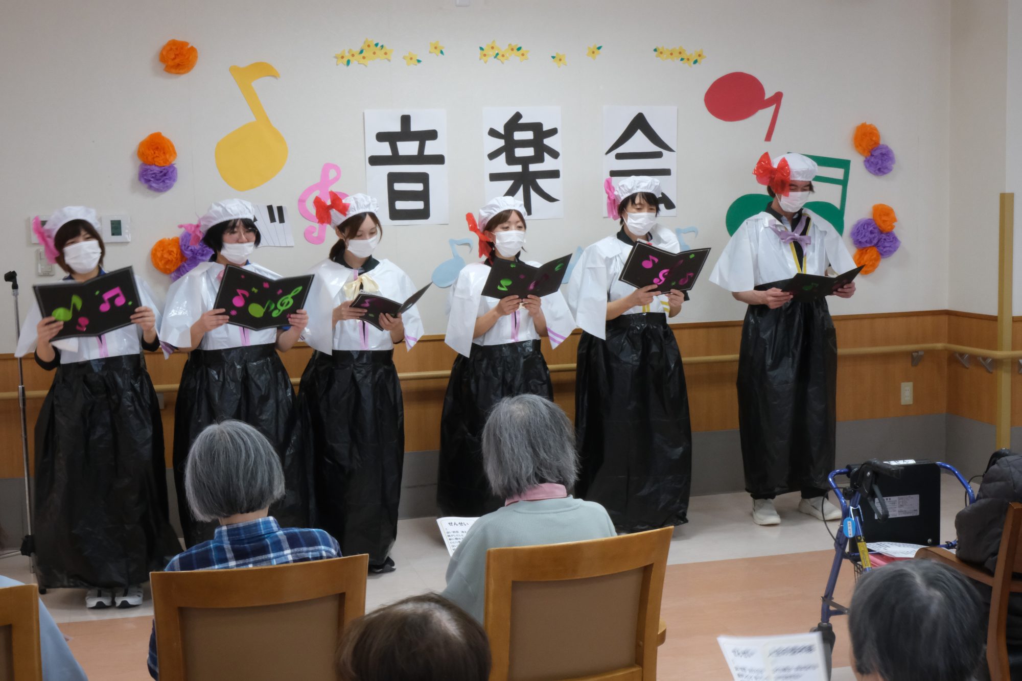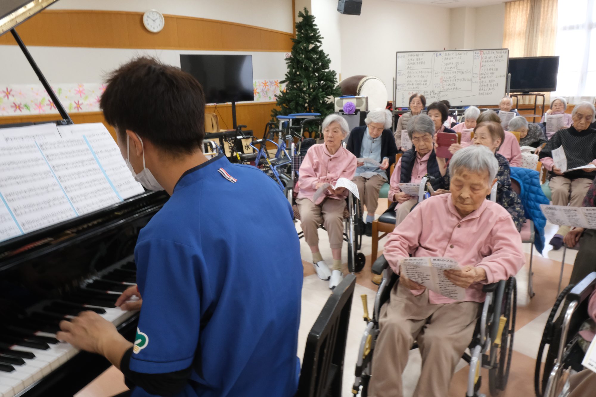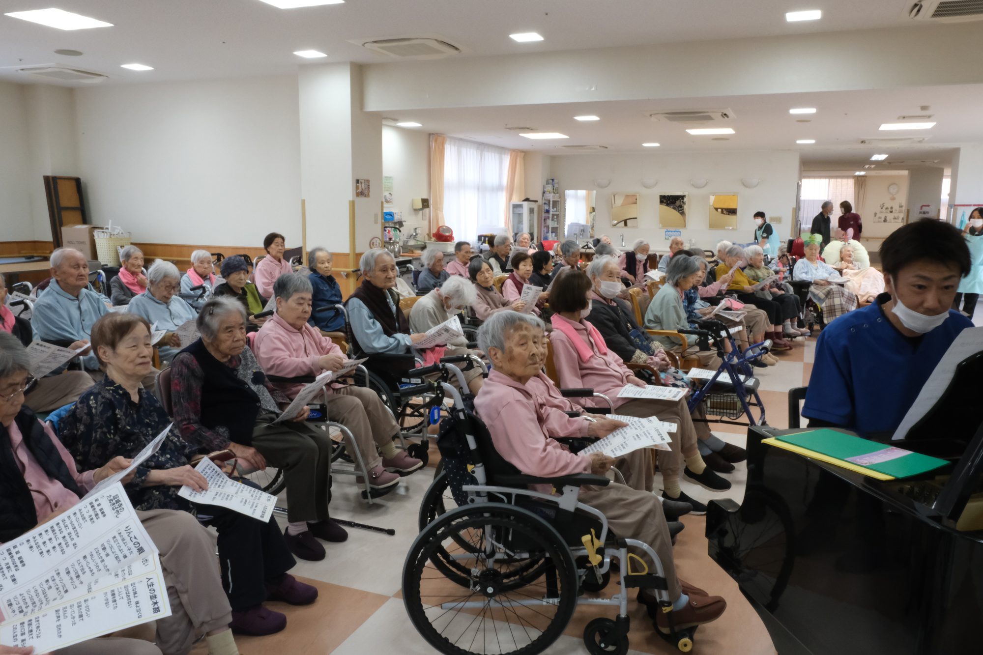 中盤にはスタッフによる『もみじ』『翼をください』の二部合唱、ピアノ演奏『花は咲く』、『いい日旅立ち』が披露されました。二部合唱はこの日のためにスタッフが休憩時間に集まって練習を重ねてきましたが、本番は少し失敗してしまい…。ですが、利用者様からは温かな拍手をいただきました。