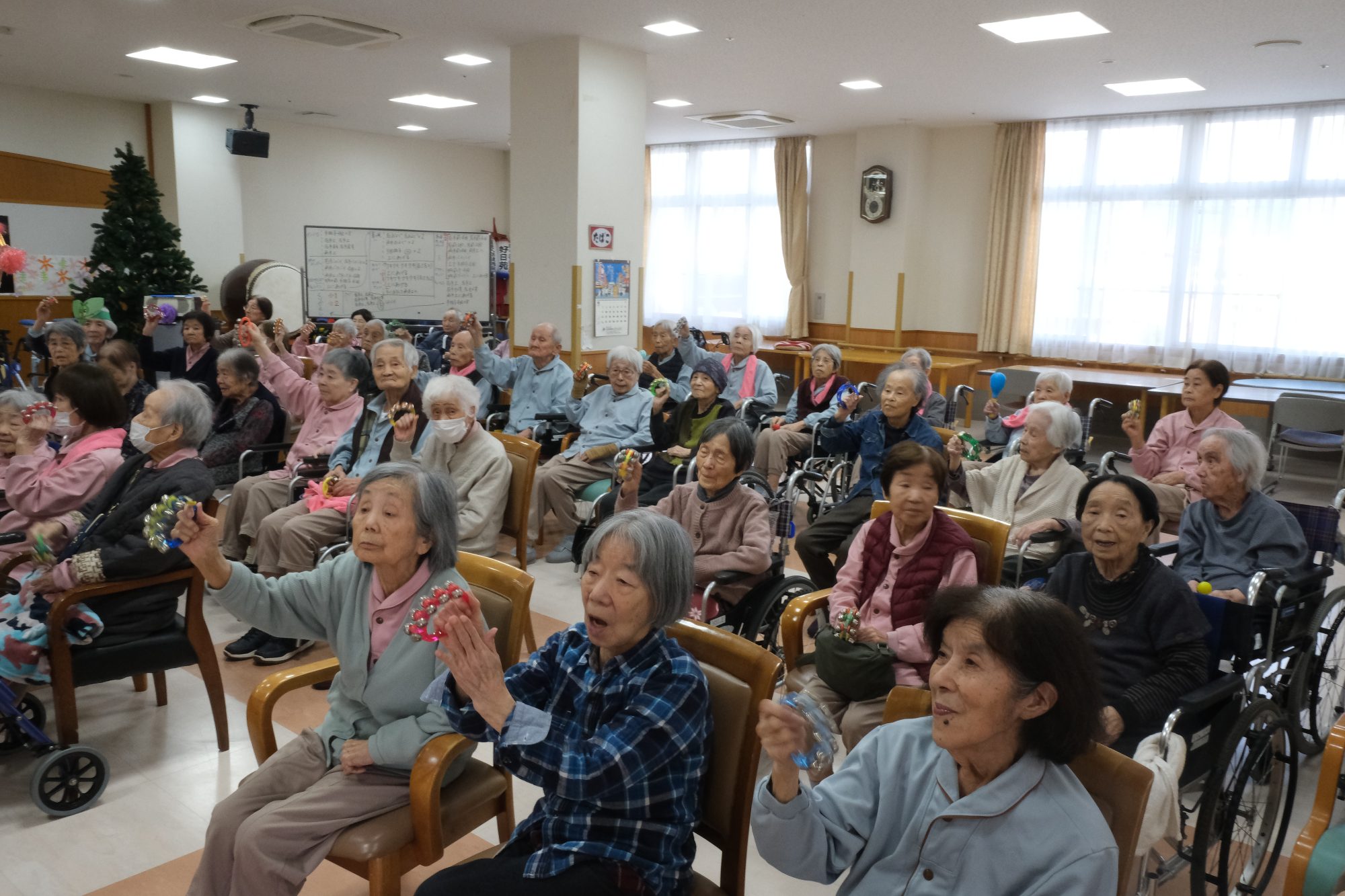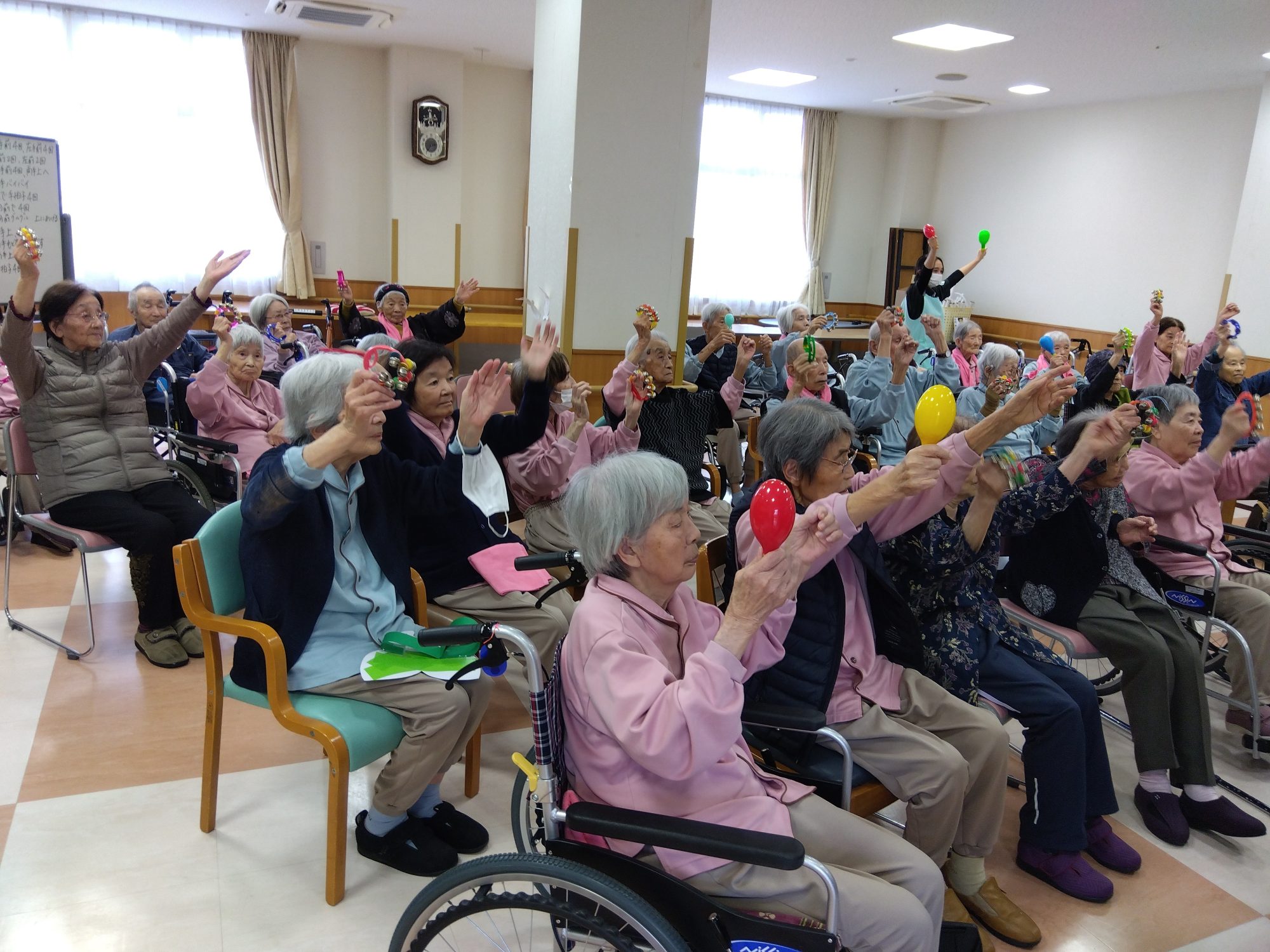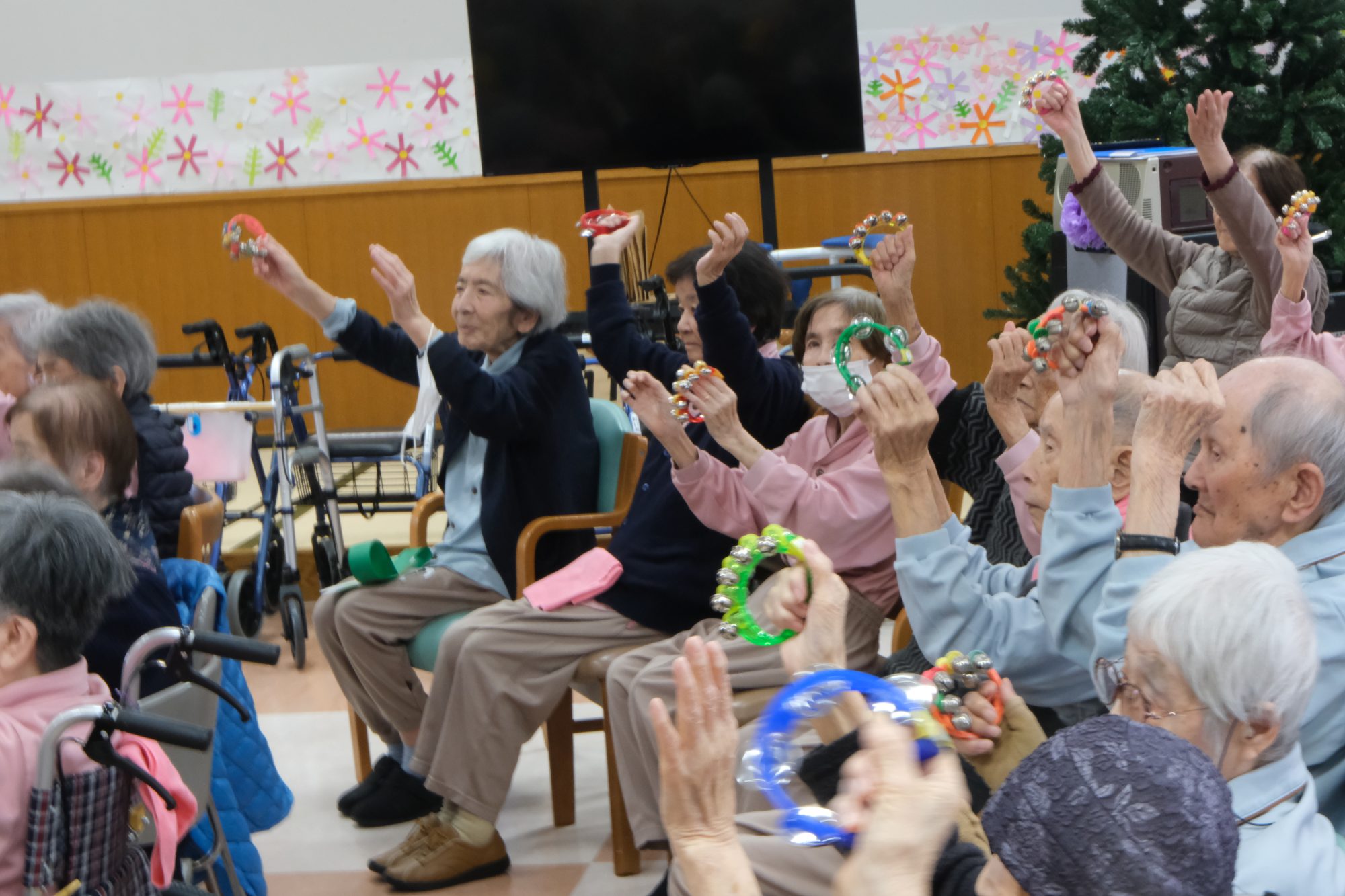 最後は『マツケンサンバ』のピアノ演奏に合わせて、利用者様と一緒に楽器を持って踊りを踊りました。各階ごとに練習はしましたが、本番はどうなるかと思いきや、皆さんしっかりとお手本を見ながら踊りきることができました!普段はおっとりしている利用者様もこの時ばかりは手に取ったマラカスを沢山振ってくださったり、笑顔でリズムをとってくださったりと一体感が生まれました。
