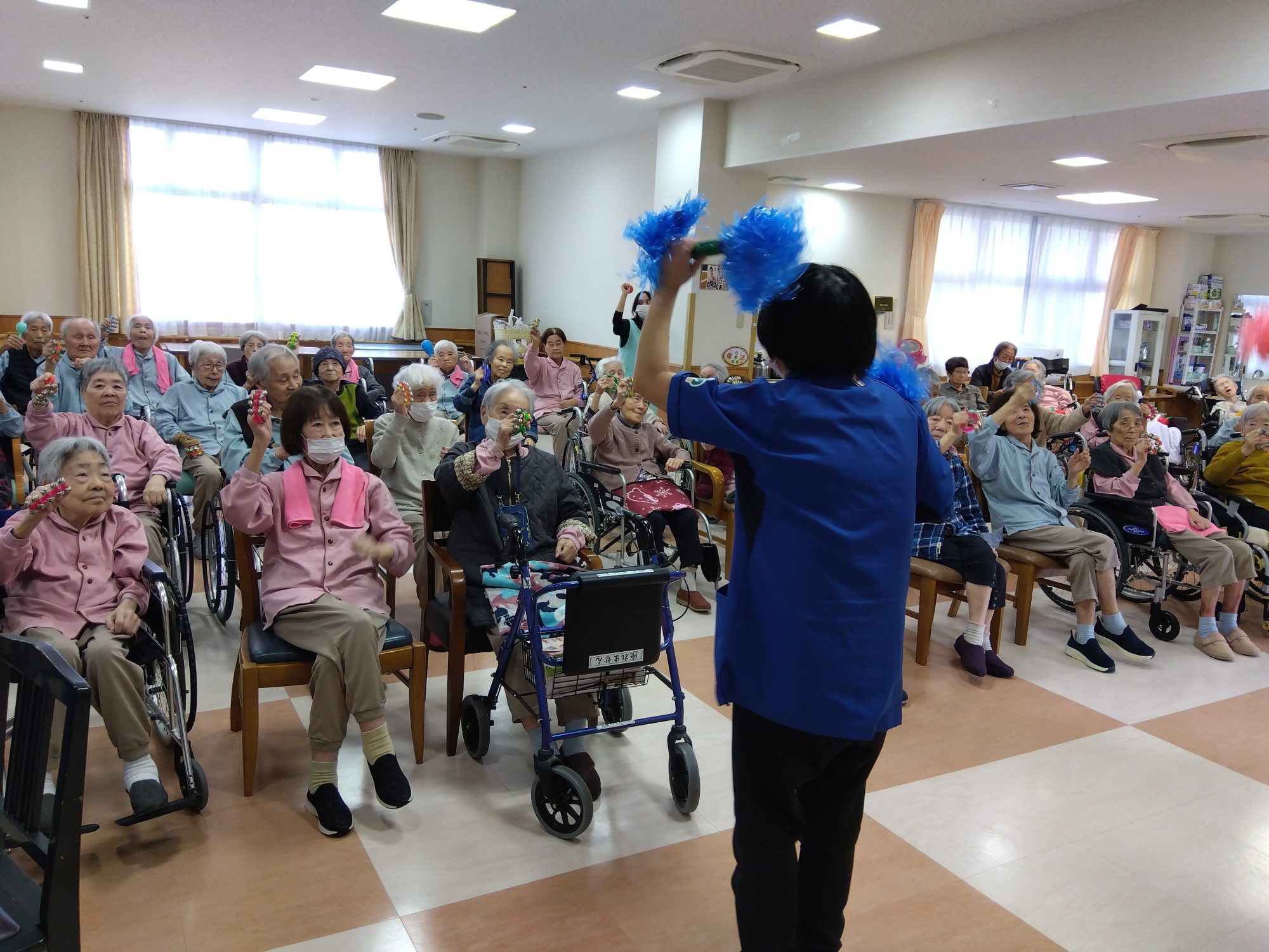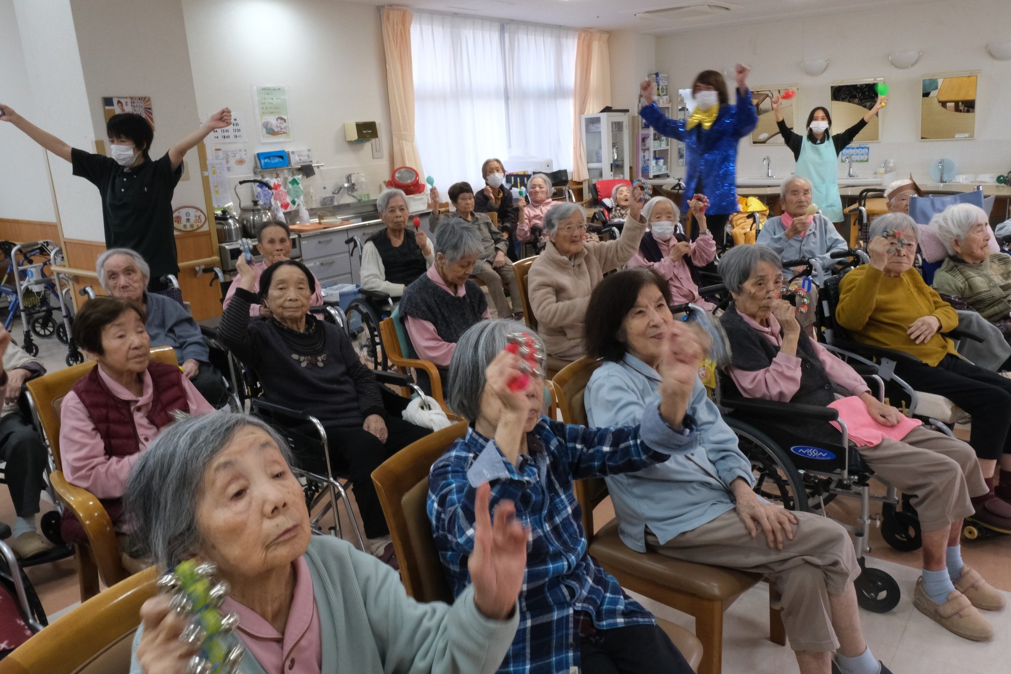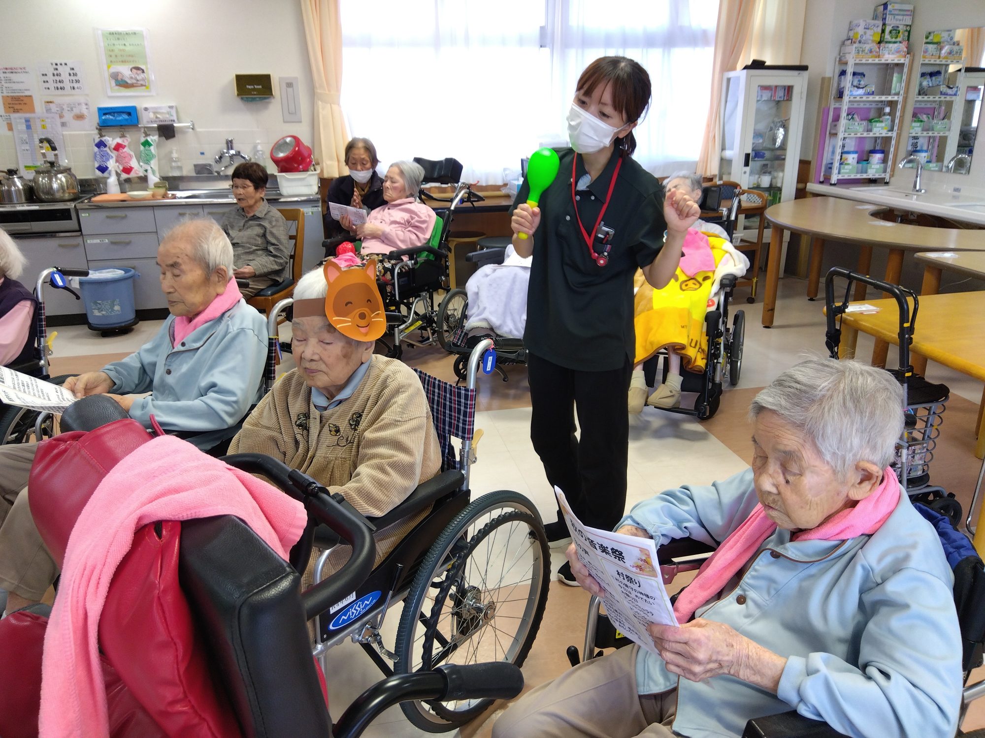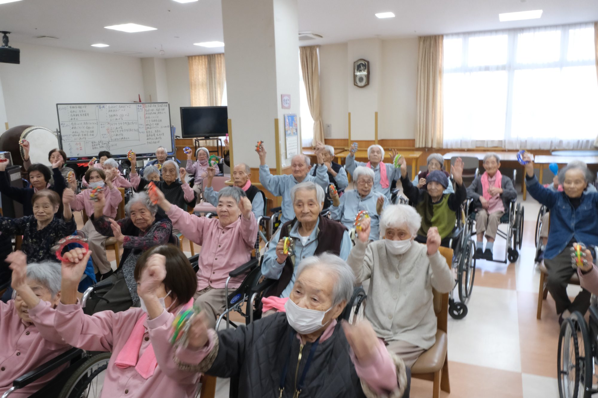 最後は『マツケンサンバ』のピアノ演奏に合わせて、利用者様と一緒に楽器を持って踊りを踊りました。各階ごとに練習はしましたが、本番はどうなるかと思いきや、皆さんしっかりとお手本を見ながら踊りきることができました!普段はおっとりしている利用者様もこの時ばかりは手に取ったマラカスを沢山振ってくださったり、笑顔でリズムをとってくださったりと一体感が生まれました。